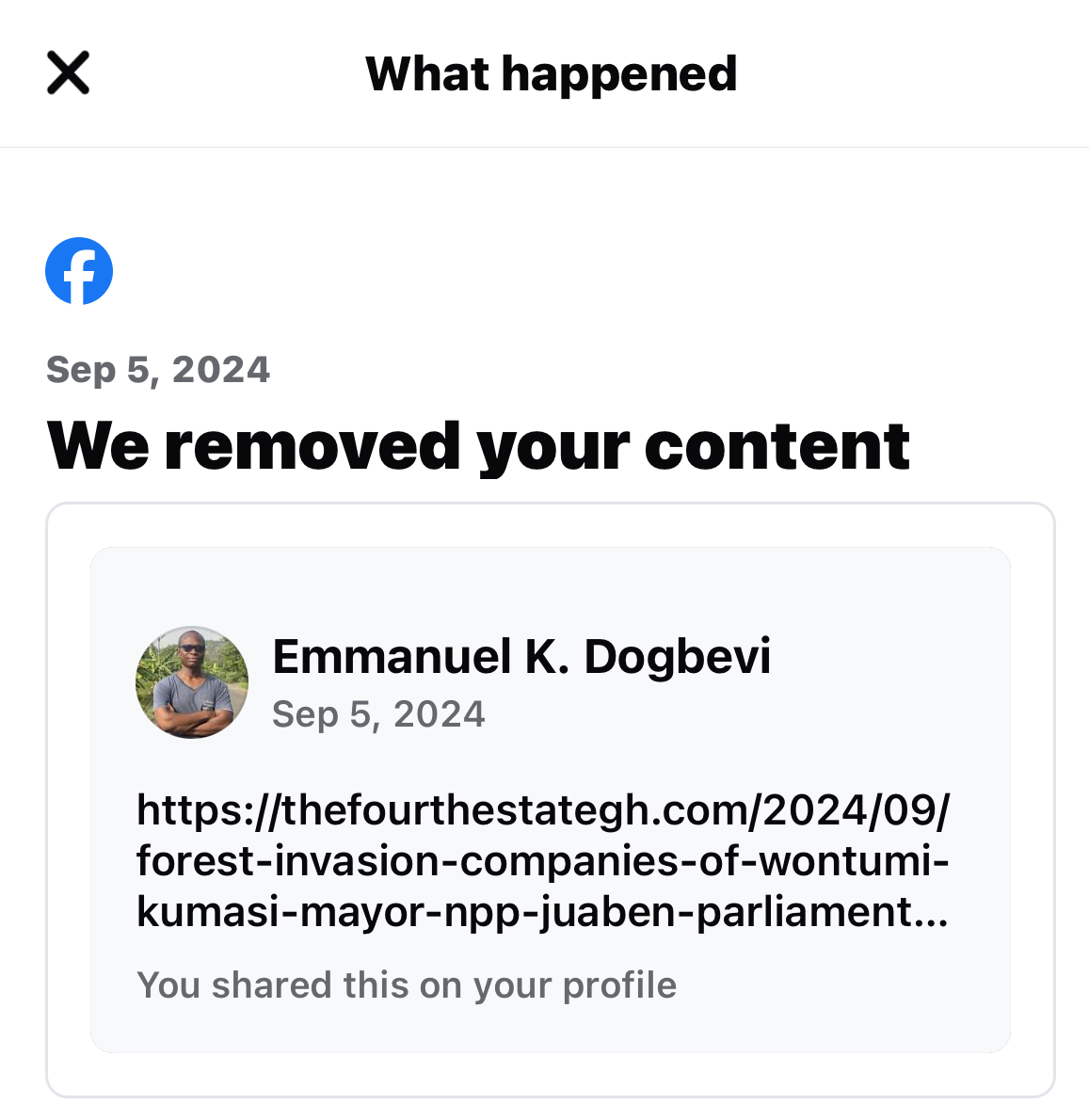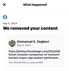 The Fourth Estate is an investigative reporting news outlet. It is the online publication of the media advocacy organisation Media Foundation for West Africa. The Fourth Estate does investigations of corruption, human rights abuse, bad governance among others. But on Thursday September 5, 2024, a widely publicised story they did uncovering the faces behind one of the monstrous acts of impunity in Ghana – mining in forest reserves has been banned by Facebook.