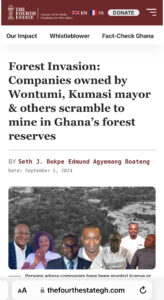 The story is titled: “Forest Invasion: Companies owned by Wontumi, Kumasi mayor & others scramble to mine in Ghana’s forest reserves”.