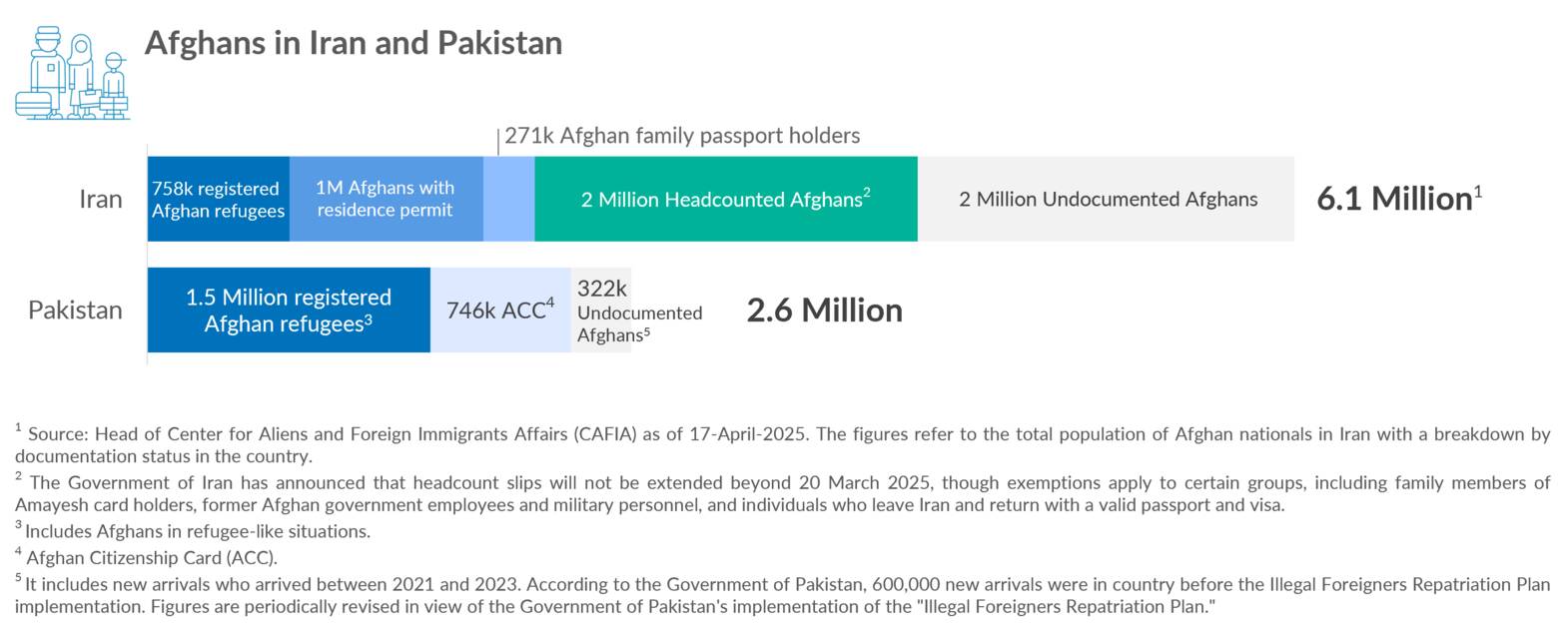 Iran and Pakistan are among the world’s major refugee-hosting countries, hosting 3.47 million and 1.75 million Afghan refugees respectively, despite facing their own challenges. Since 2023, a shift in displacement trends has been taking place that has seen mass returns, including large numbers of forced and coerced returns, back to Afghanistan. On 7 March 2025, the Government of Pakistan announced the resumption of the 'Illegal Foreigners Repatriation Plan', initially targeting Afghan Citizenship Card (ACC) holders, who were instructed to leave voluntarily by 31 March or face deportation from 1 April. On 31 July, the Government expanded the plan to also include Afghan refugees holding Proof of Registration (PoR) cards. In parallel, following Headcount slip expiry on 20 March 2025, the Government of Iran launched a regularization/return scheme for some two million affected Afghans where the majority were expected to return to Afghanistan by the Government deadline of 6 July 2025 or face deportation. These mass returns in adverse circumstances have strained Afghanistan’s already overstretched resources and services and hindered reintegration efforts, leading to risks of onward and new displacement, including return movements back into Pakistan and Iran and onward. UNHCR reiterates its concern that many Afghans – regardless of status – face serious protection risks in Afghanistan due to the current human rights situation, especially women and girls. These risks are made more urgent by critical funding shortfalls, with only 24% of the required $478 million secured for the Afghanistan situation. This page provides updates on UNHCR's work in support of Afghan IDPs, refugees, and returnees. Links are also provided below for individual UNHCR country operation pages for additional information.