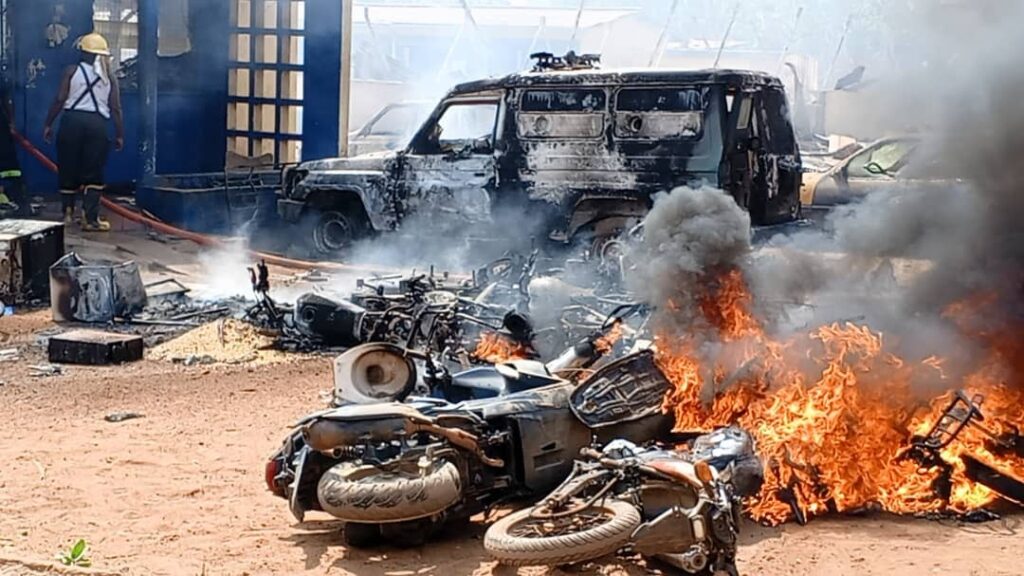 The officers sensing danger ran away and the agitated youth set fire to the entire police station burning it together with police vehicles and other valuable items into ashes.